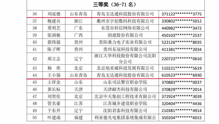 本次活動中,青島安防協(xié)會副理事長單位——青島文達通科技股份有限公司的劉延德、王小強分別在首屆全國安防行業(yè)職業(yè)技能競賽總決賽中榮獲三等獎,與此同時,青島文達通科技股份有限公司榮獲“競賽優(yōu)勝單位”獎。